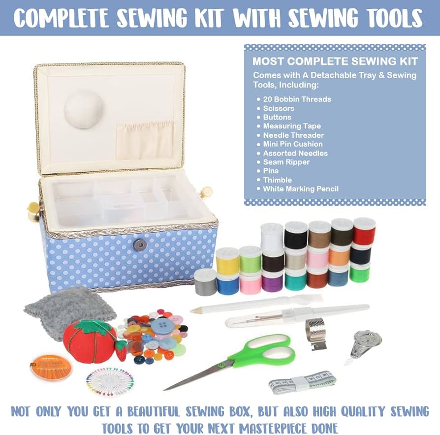 Amazon Com Sewing Box With Accessories Sewing Storage And Organizer With Complete Sewing Kits Tools Wooden Sewing Basket With Removable Tray And Tomato Pincushion For Sewing Mending Blue